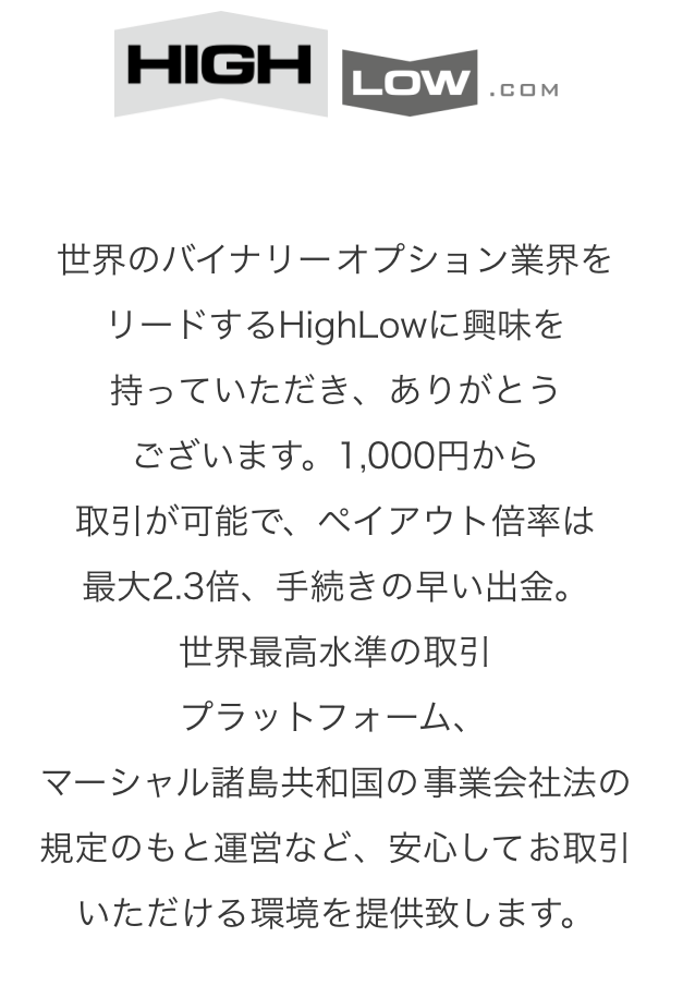 バイナリーオプションを始めようとお考えの方は、バイナリーオプションサービスでメリットの多いハイローHIGHLOWのロ座をお勧めいたします。